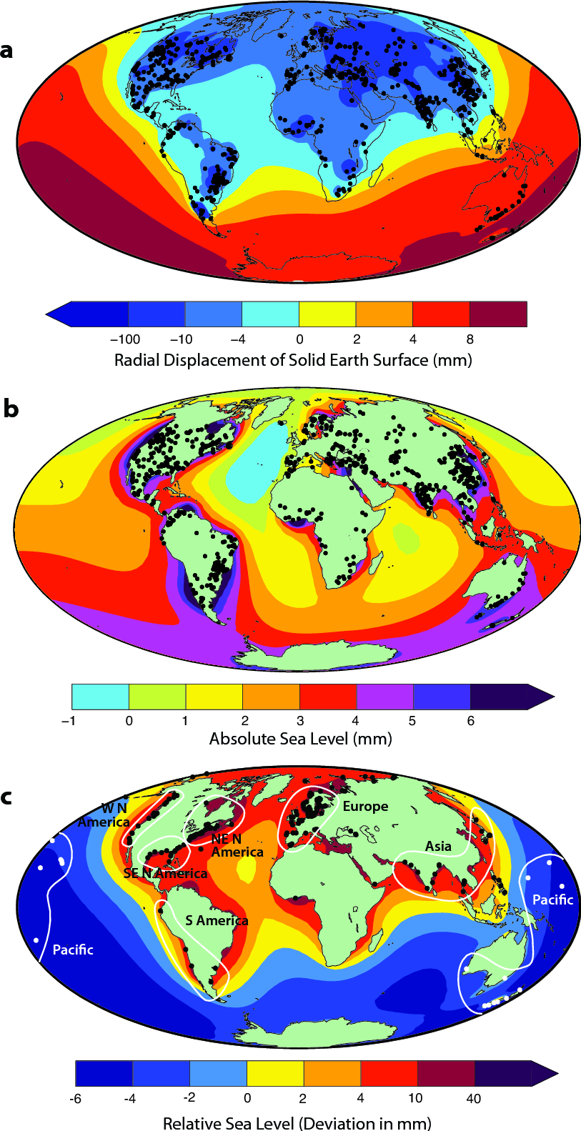 We computed the Earth's elastic response to the movement of water from the oceans to continental reservoirs of water impounded by dams. Shown above are the (a) radial displacement, (b) deflection of absolute sea level, and (c) deflection of relative sea level, which is simply absolute sea level measured relative to the solid earth surface. Dots in (a) and (b) are dam load locations and dots in (c) are tide gauge locations. These results have been detailed in an upcoming paper: